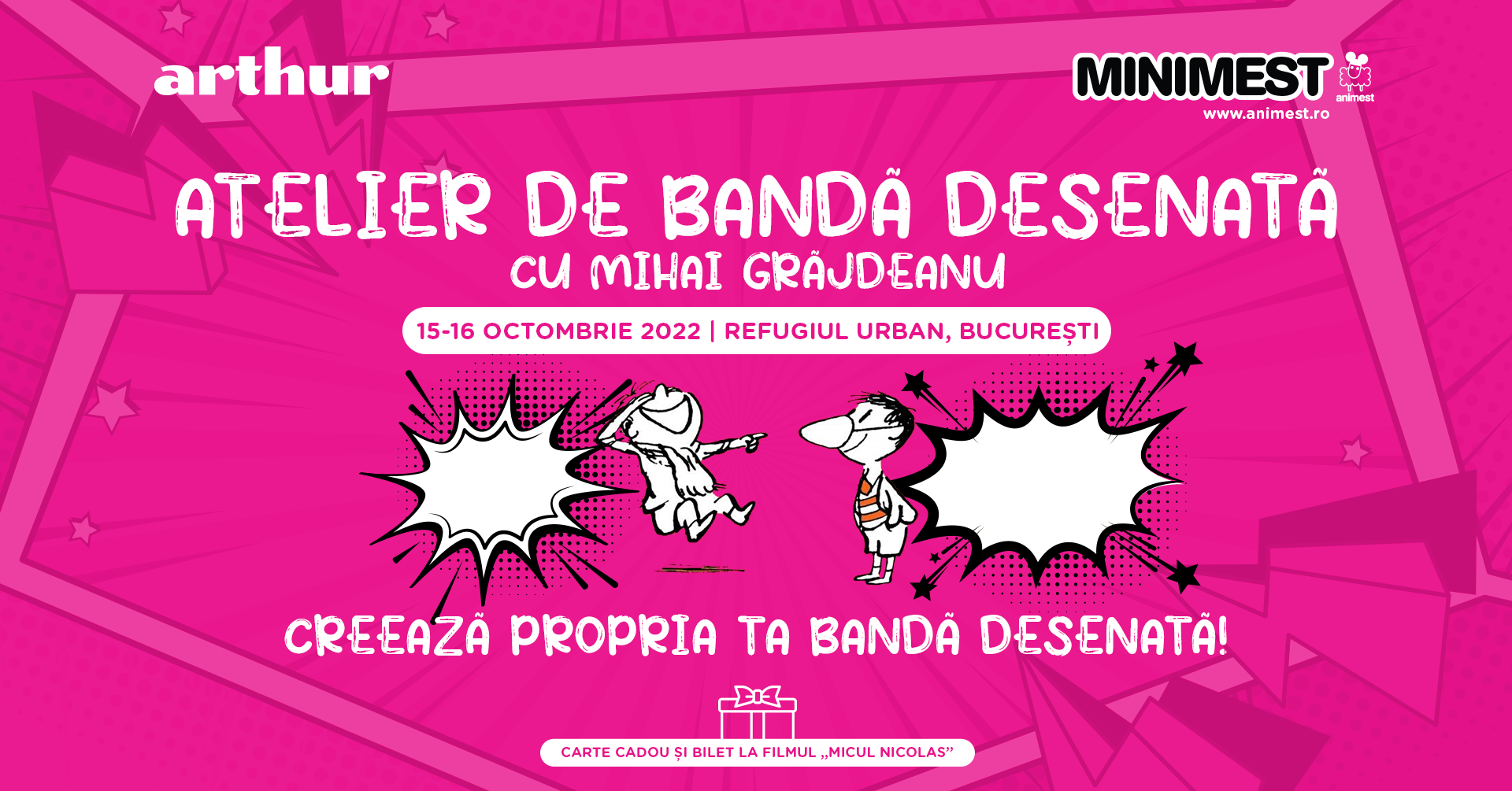 Pe parcursul atelierelor de Benzi Desenate, organizate în parteneriat cu Editura Arthur, autorul și profesorul de benzi desenate Mihai I. Grăjdeanu îi invită pe copii să descopere tainele realizării unei benzi desenate (BD): de la pașii necesari pentru a crea o fâșie sau o pagină BD, până la realizarea propriei reviste sau cărți.