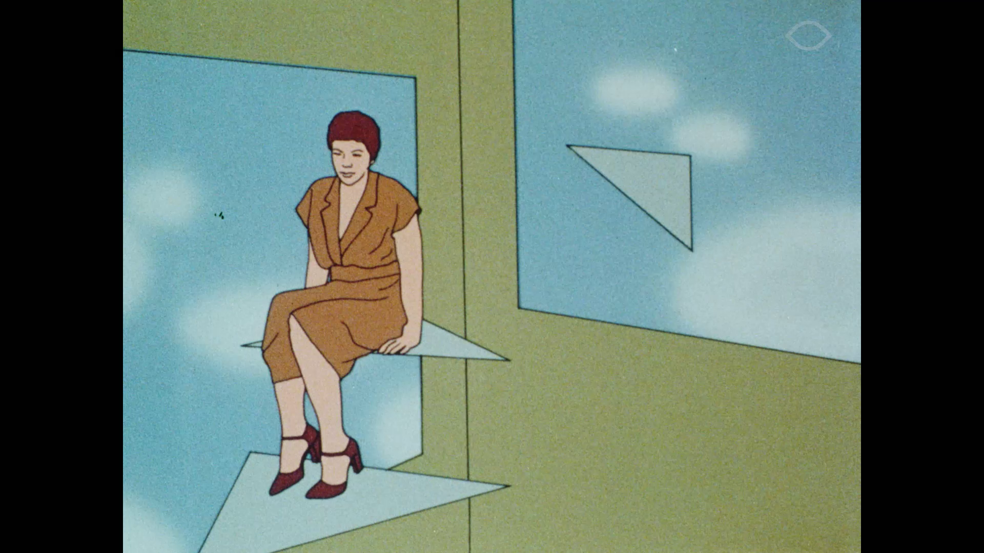 A woman goes down an endless and increasingly abstract spiral stairway.
