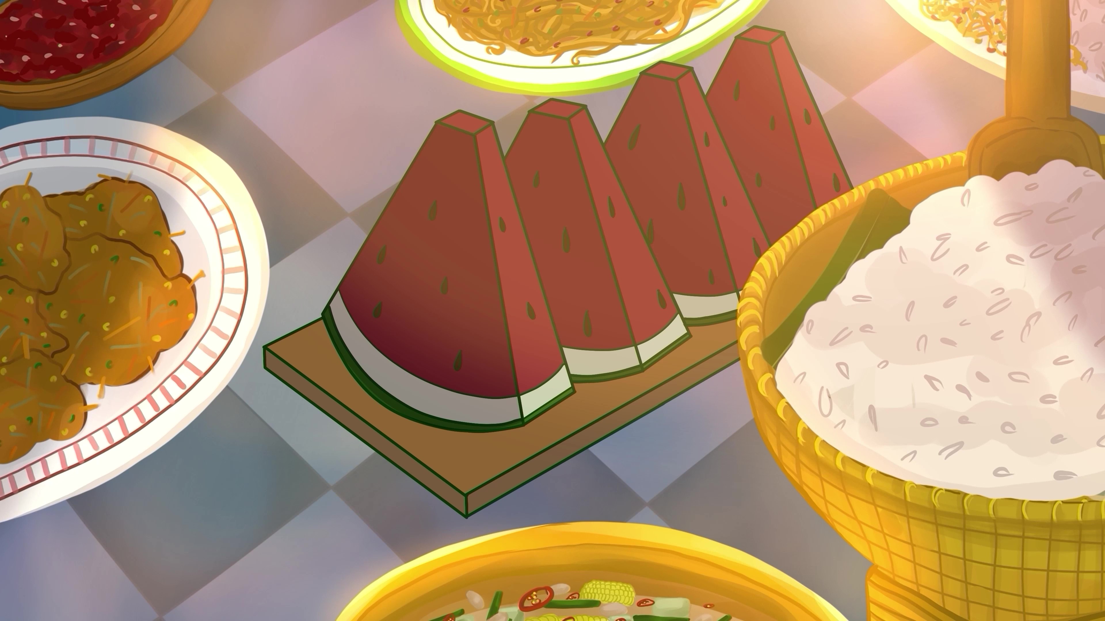 După-amiază, în sufragerie, o familie ia cina. Copilul vrea să mănânce pepene roșu și este avertizat de fratele său mai mare să nu uite să scoată semințele. Fratele mai mic ignoră avertismentul și începe să-și imagineze că i se va întâmpla ceva rău.